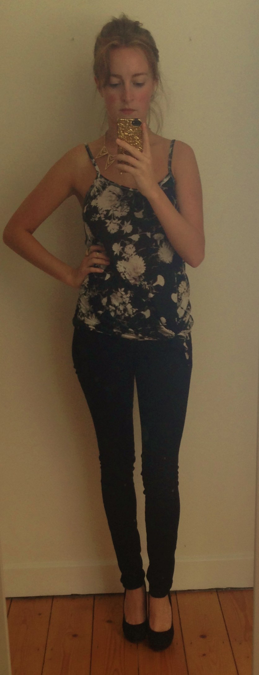 So I threw an outfit together because I was so excited to show you guys. Ignore the horrible hair and face with no make up! The top is actually a dress from the Rihanna for River Island range. I just tie a knot in it to turn it into a top. The shoes are Dune. The necklace, which I doubt you can see thanks to my big hand, is Topshop.