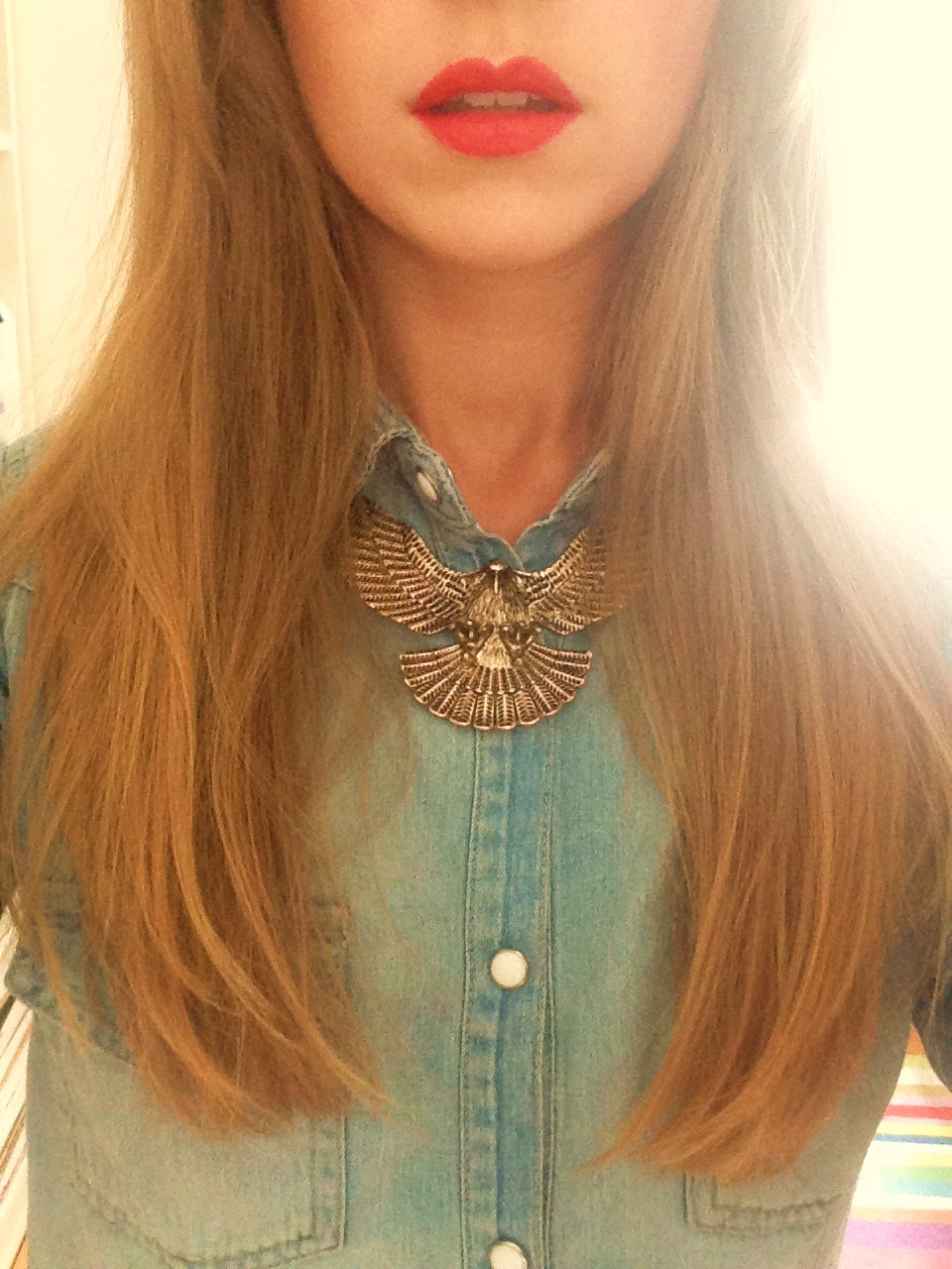So here was today’s outfit. I love this light denim shirt. Its actually my sisters so hopefully she doesn’t see this post! I wore this gold Topshop eagle necklace as a collar. Its a bit of a twist on the collar trend and really adds a focus to the shirt.