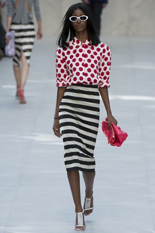 Without a doubt, my favourite trend from London Fashion Week. Love, love, love these beautiful pink looks. From pretty pastels, to florals, to polka dots, lace and accessories, pink is the It colour of SS 14. Pink looks great on every hair colour and skin tone and can be a simple way to update an outfit. Take the all white outfit at the bottom from Burberry Prorsum. The pink shoes and bag make the outfit feel fresh and new. Burberry also contrasted pink polka dots with a striped tube skirt, great look. My favourite has to be the second dress here from Preen by Thornton Bregazzi. I’ll be seeing that dress in my dreams!