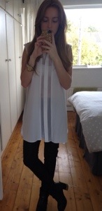 The shirt has sheer panels down the front and then the back is completely sheer. It work I used to wear a white or black cami underneath to make it more work appropriate. Going out I usually wear a bandeau or something interesting underneath that can be seen through the sheer panels. I wore it with a white bandeau, my leather pants and boots today (monochrome as usual!). I’ve been pretty bad at accessorising lately, I either forget to put stuff on or I’m just too lazy. Today I have a bit of arm candy with my Asos watch and then an assortment of bracelets.