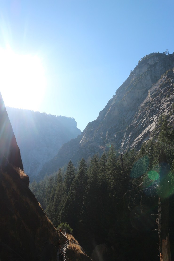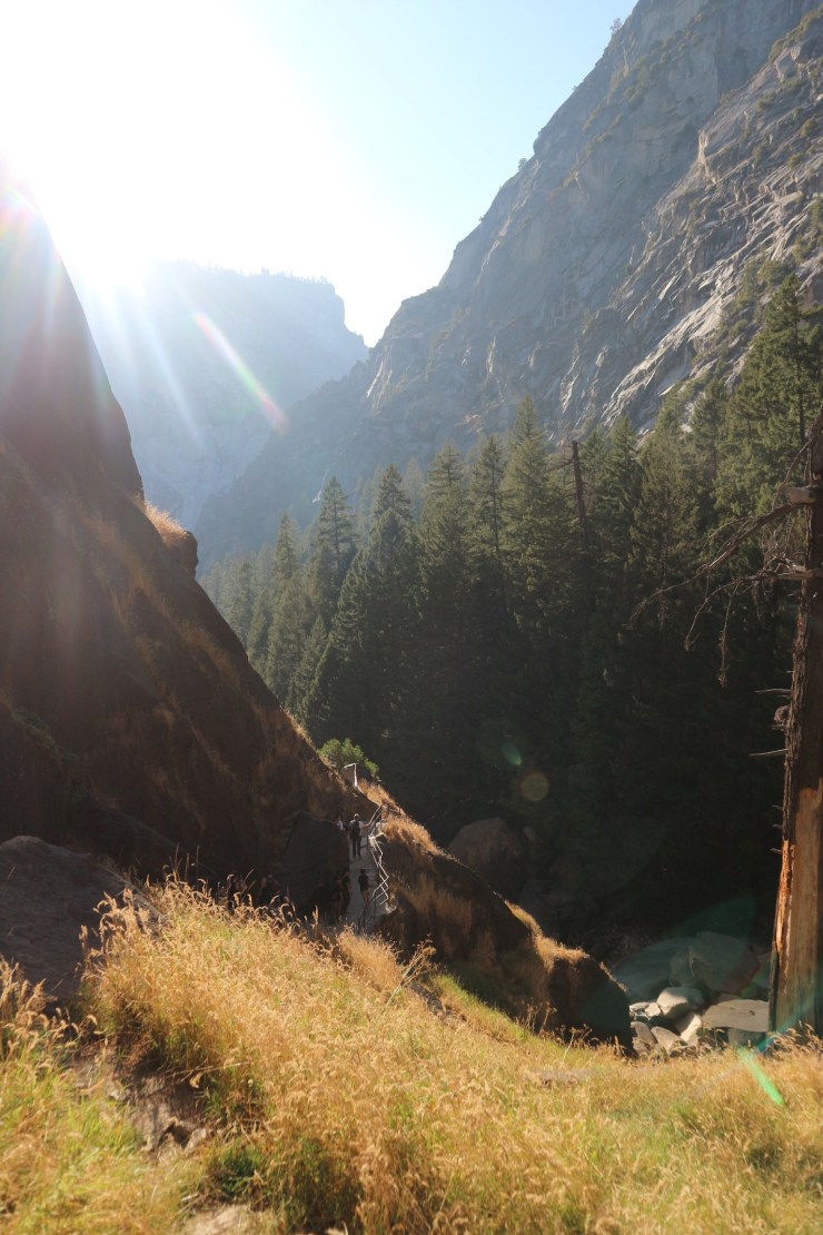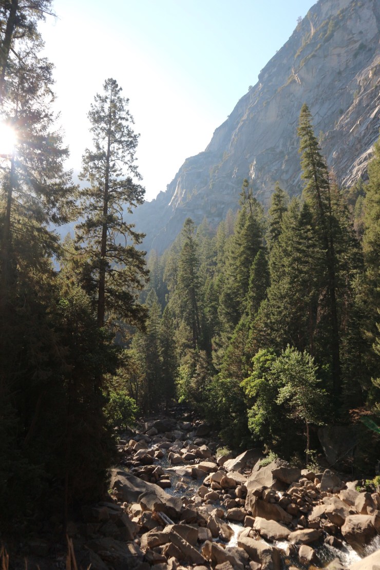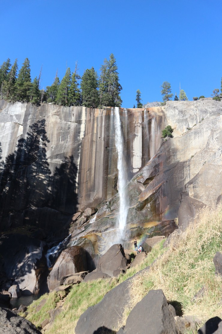 Eventually we were told about a trail called the John Muir trail, which went up to a waterfall called Sentinal Falls (I think, memory is a little fuzzy on this!). The John Muir trail is 211 mile trail in total, we obviously only did a teeny tiny portion of it! The view was unbelievable. It’s honestly easy to run out of superlatives when talking about Yosemite, because it really is on another level. The view across the valley as the sun went down, the rainbow going through the waterfall, the granite mountains appearing out of nowhere. It was insane.